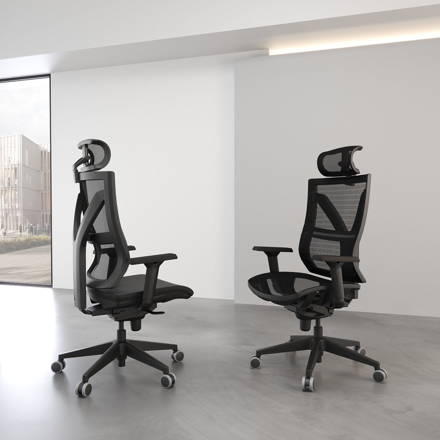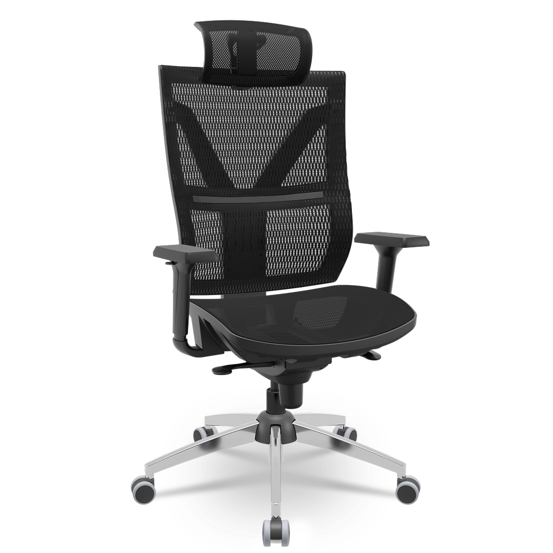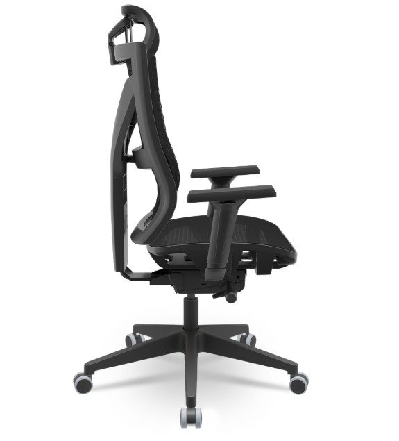 Assento e encosto Em tela bi-elástica, material de alta elasticidade que se molda ao corpo, promove ventilação constante e proporciona suporte lombar natural durante todo o dia